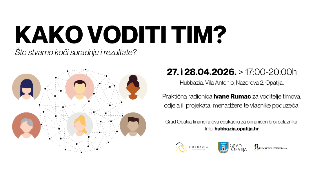 Grad Opatija i poduzetnički inkubator Grada Opatije – Hubbazia pozivaju voditelje timova, voditelje odjela i projekata, menadžere te vlasnike poduzeća koji upravljaju ljudima i odgovornostima na radionicu „Kako voditi tim: što stvarno koči suradnju i rezultate?“, koja će se održati 27. i 28.04.2026. od 17 – 20h u Hubbaziji, Vila Antonio, Nazorova 2, Opatija.